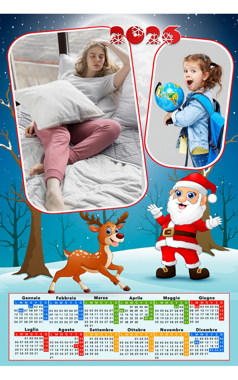 Il foto calendario Babbo Natale e la Renna viene stampato su carta fotografica lucida o opaca a tua scelta, puoi personalizzare il calendario una pagina inserendo una foto tra i tuoi scatti più belli.