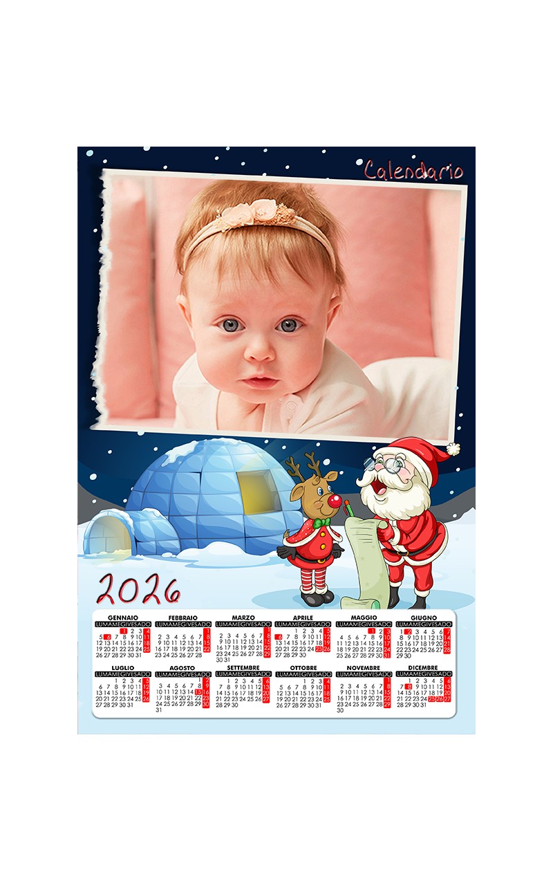 Il foto calendario Babbo Natale viene stampato su carta fotografica lucida o opaca a tua scelta, puoi personalizzare il calendario una pagina inserendo una foto tra i tuoi scatti più belli.