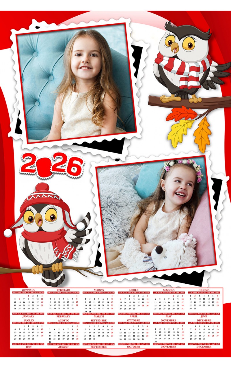 Il foto calendario Gufetto Buon Natale viene stampato nel formato 30x45 carta fotografica a tua scelta lucida o opaca, personalizza il calendario 1 pagina inserendo una foto verticale tra i tuoi scatti più belli.