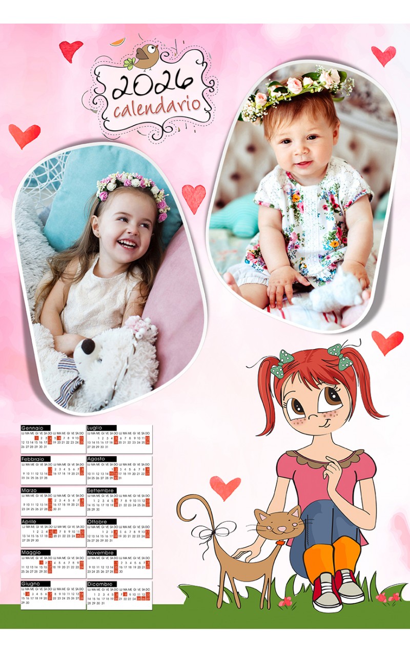 Il foto calendario Gatto in love viene stampato nel formato 30x45 carta fotografica a tua scelta lucida o opaca, puoi personalizzare il calendario 1 pagina inserendo due foto tra i tuoi scatti più belli.