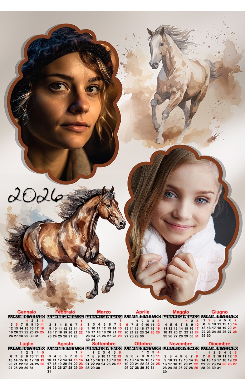 Il foto calendario Indiani viene stampato nel formato 30x45 carta fotografica a tua scelta lucida o opaca, puoi personalizzare il calendario 1 pagina inserendo una foto verticale tra i tuoi scatti più belli.