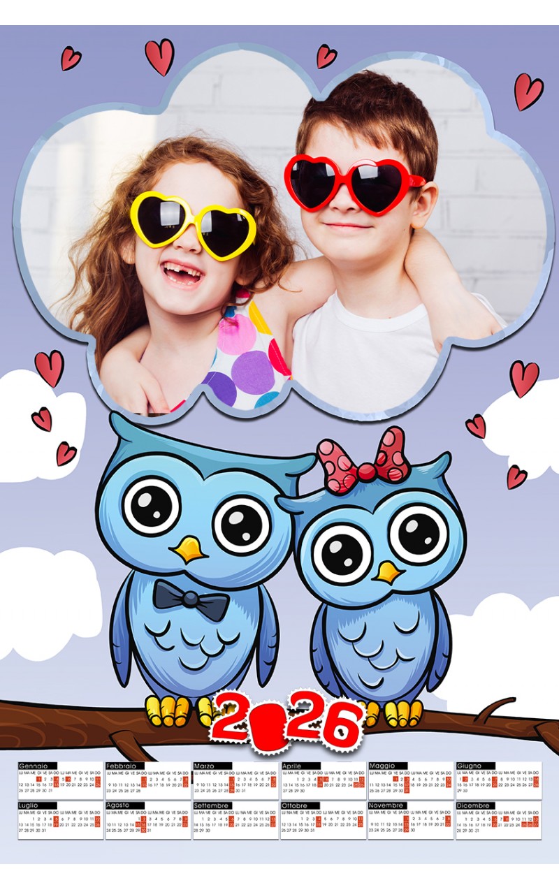 Personalizza il Fotocalendario 1 pagina Gufi Innamorati con il tuo scatto più bello. Il Calendario una pagina sarà stampato nel formato 30x45 a tua scelta su Carta Fotografica Lucida o Opaca.