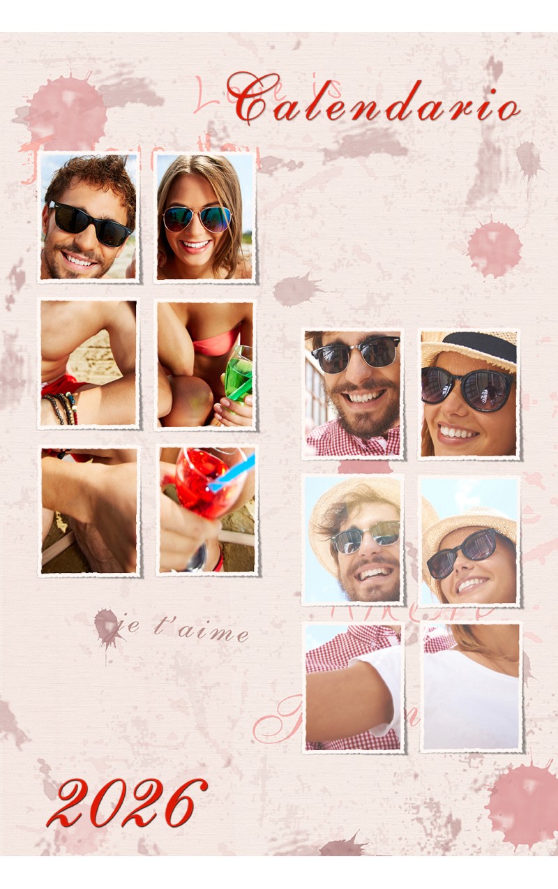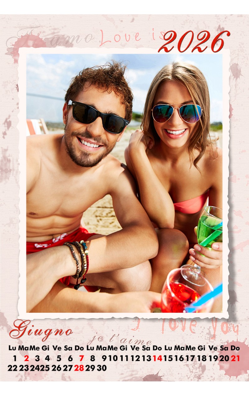 Il Calendario Ti Amo presenta un'effetto cartolina in verticale con fondo rosa e frasi per innamorati.