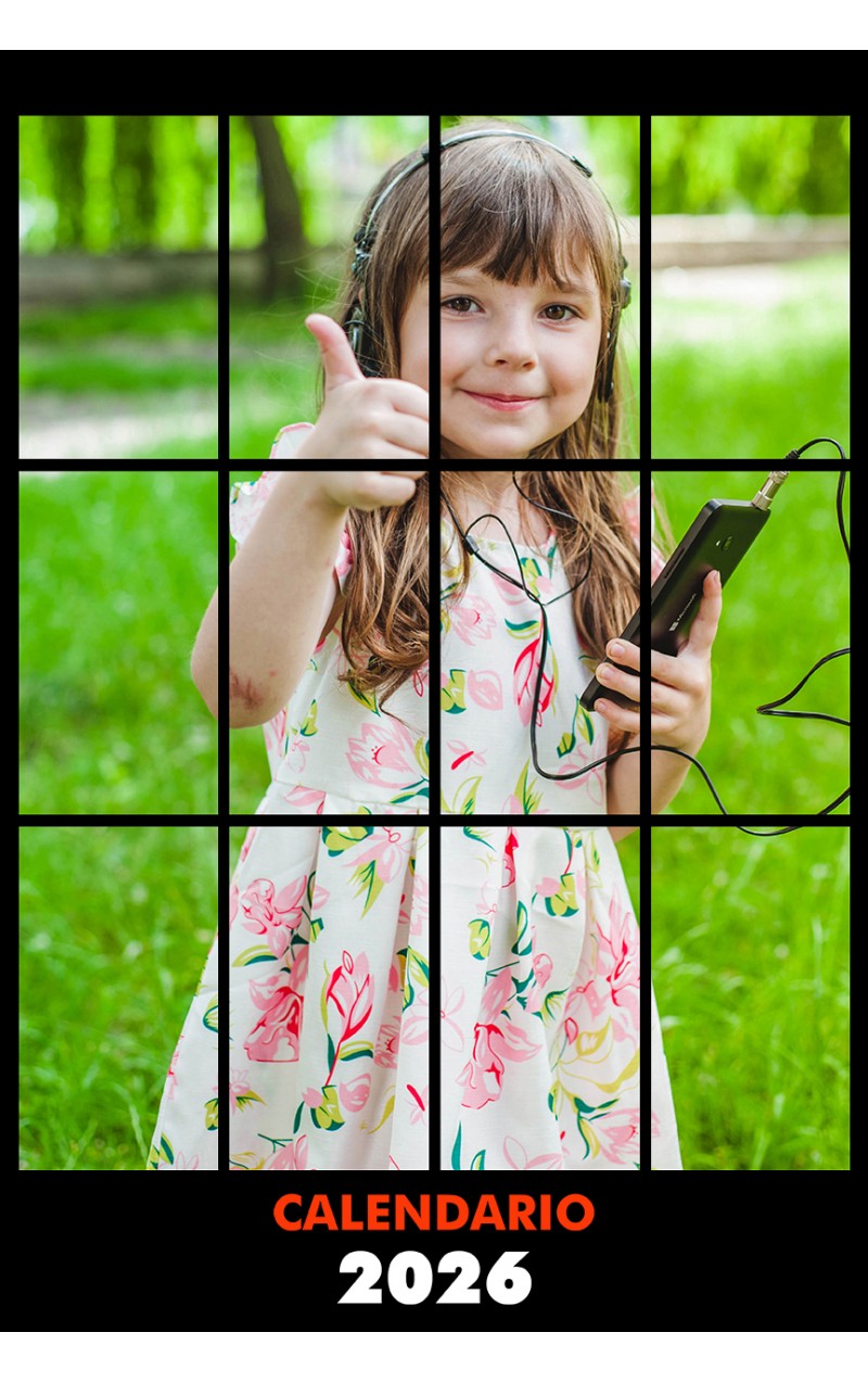Carica 13 tra le tue foto più belle ed inizia la tua creazione, riceveri il Calendario 13 pagine a casa tua rilegato con spirale e gancio metallico.
