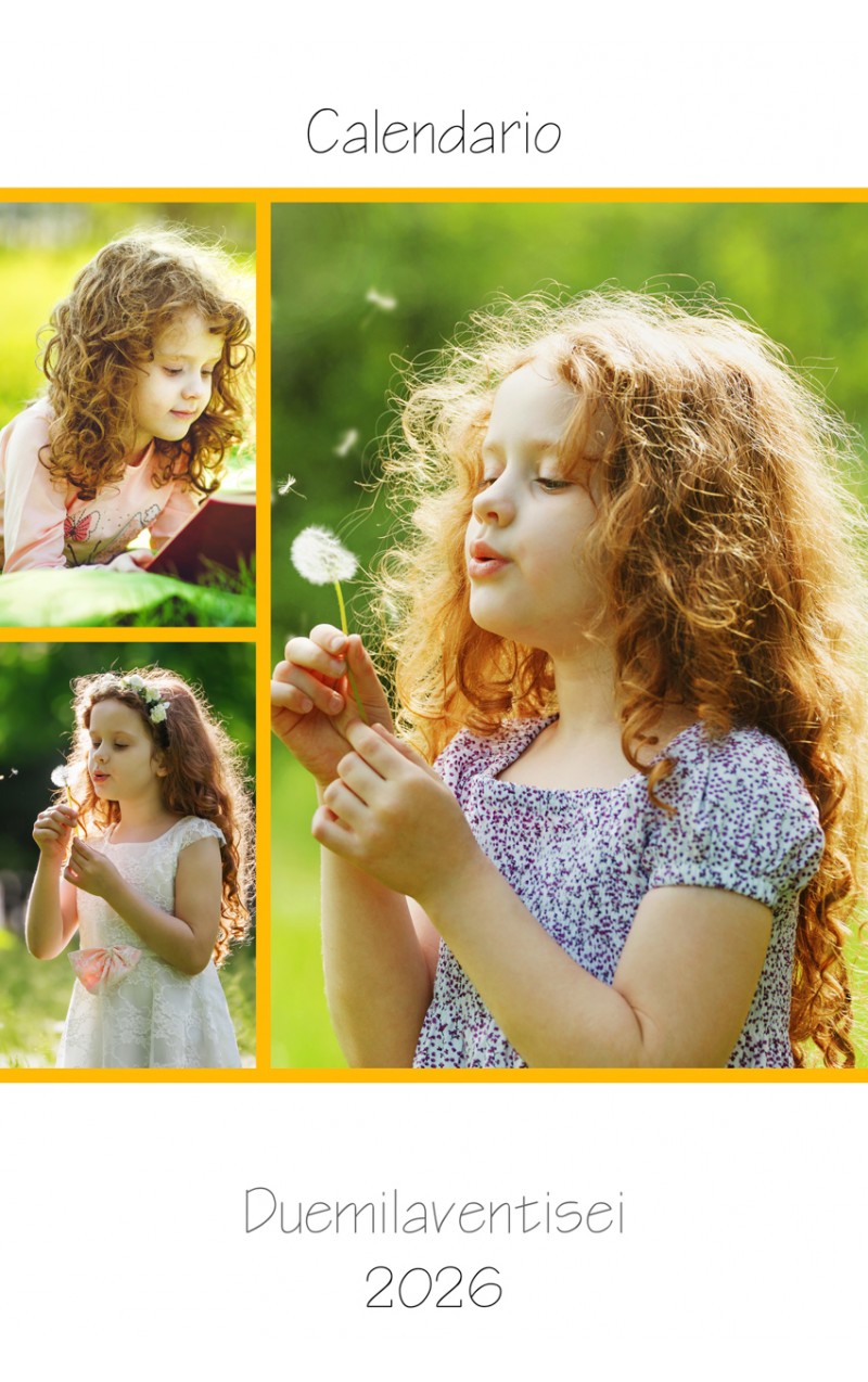 Crea il Fotocalendario Vertical Yellow Frame, scegli 13 delle tue foto più belle e divertiti e personalizzando il calendario con la tua foto in una cornice nera verticale ed un datario chiaro con numeri grandi.