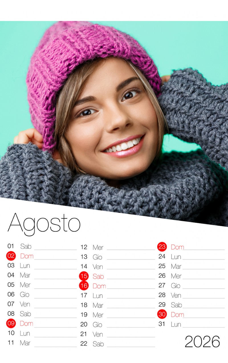 Il Fotocalendario 13 pagine con copertina viene stampato su Carta Patinata da 200 Gr. nel formato 20x30 o 30x45 e rilegato con spirale e gancio metallico.