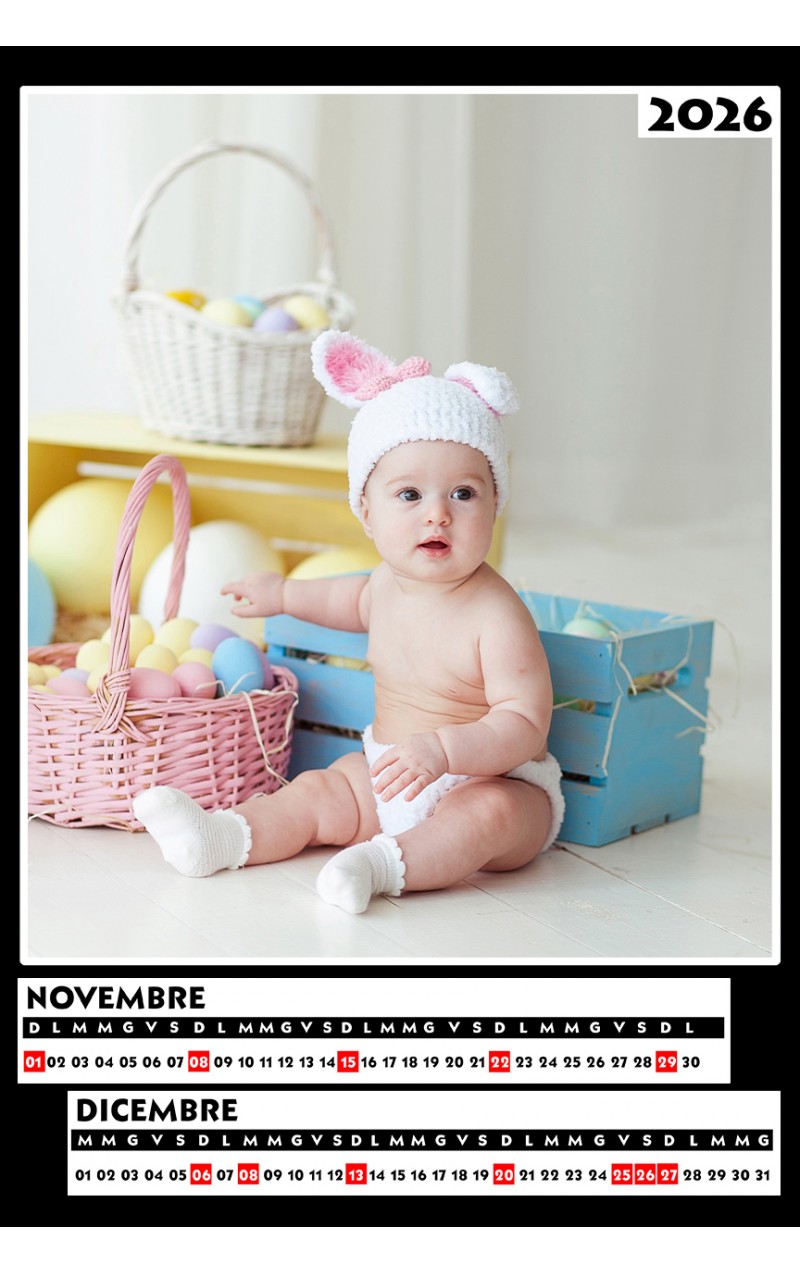 Il Calendario Elegante presenta in datario scuro con fondo bianco, viene stampato nel formato 20x30 o 30x45 su carta fotografica Lucida o Opaca a tua scelta.