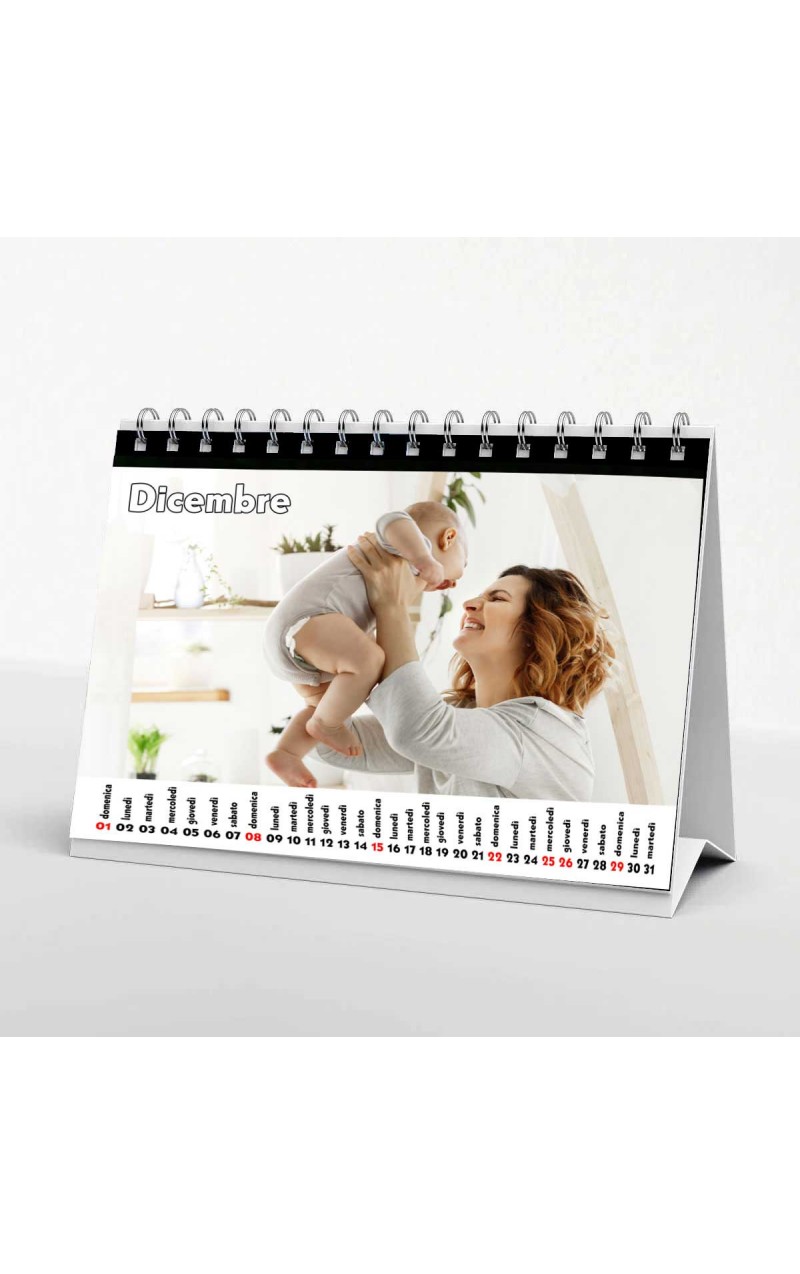 Personalizza il tuo calendario con le foto più belle e riceverai il Calendario da Tavolo rilegato con spirale metallica e montato su una base in cartoncino per esporlo sul tavolo.
